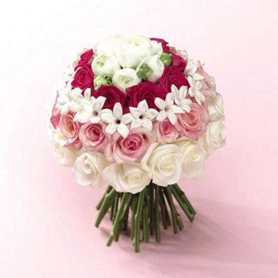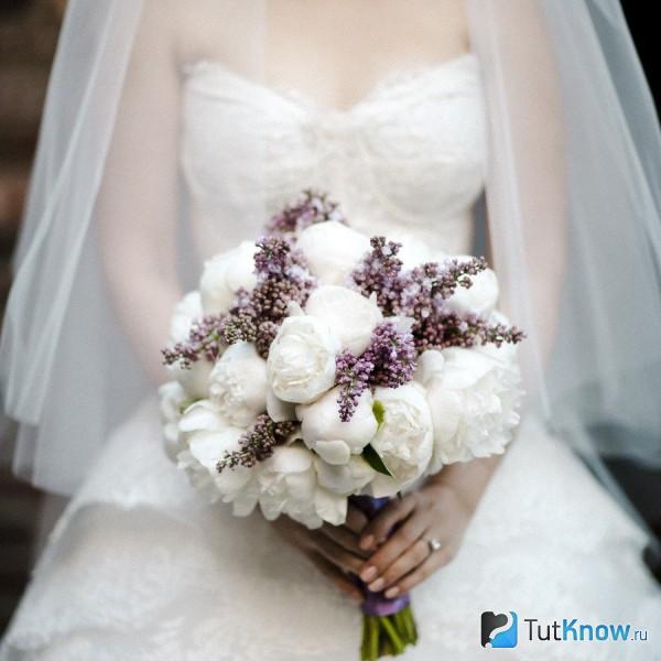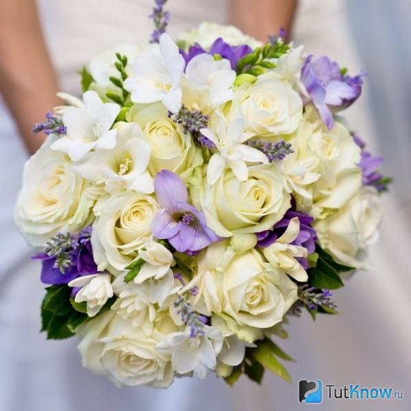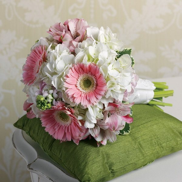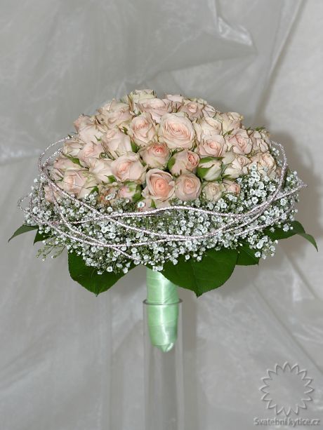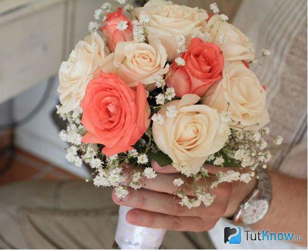 Обычно бывает округлой формы, пастельных цветов, может составляться из роз, пионов, гортензий, разбавленных веточками гипсофилы.