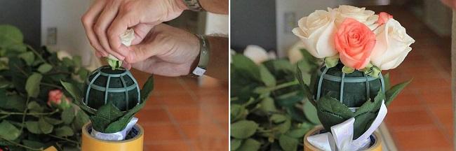 c) с помощью клея — данная технология уместна также для крупных и массивных цветов. Заключается она в том, что перед тем, как вставить цветок в оазис, его ножка обрабатывается клеем.