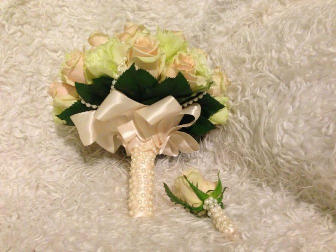 Такой букет можно назвать гламурным ретро. Неяркие, но шикарные светло-розовый, кремовый, беж и нюд, изысканные дополнения в виде кружев, жемчуга и винтажных украшений.