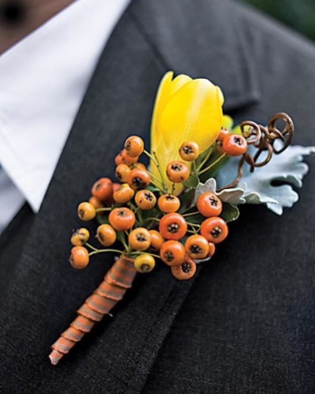 Сухоцветия – высушенные растения – смотрятся очень привлекательно и не меняют свой внешний вид. Следует быть внимательными при выборе сухоцветий, ведь некоторые высушенные цветы становятся очень хрупкими. Бутоньерки из сухих цветов пока только набирают популярность и выглядят очень оригинально.