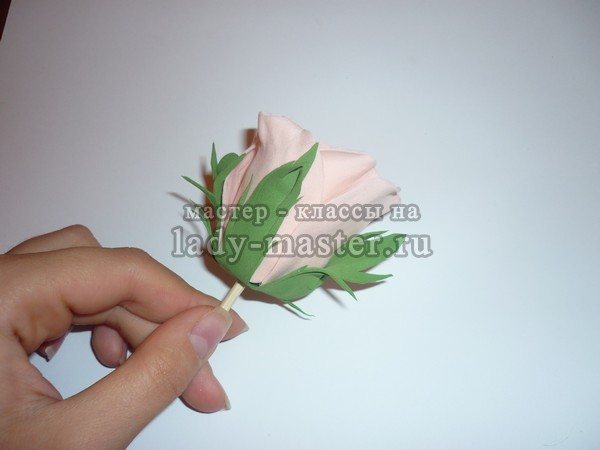 Все последующие лепестки после первого должны быть снижены по крепежу на 1-2 мм. Таким образом, бутон будет выглядеть более естественно. Первый слой состоит из 3 лепестков. Следующий из 5. Обязательно к бутону розы нужно добавить зелень, чтобы она смотрелась не только красивой, но и живой. Для этого вырезается из фоамирана зеленого цвета четырехлистник, скручивается, сминается, расправляется и нанизывается на проволоку так, чтобы листики оказались под бутоном. Каждый кончик чашелистика приклеивается к основанию розы.