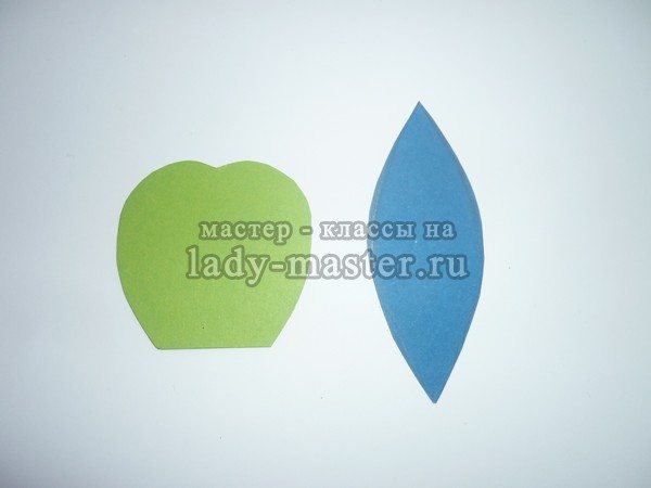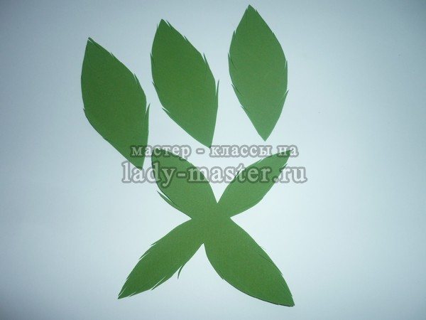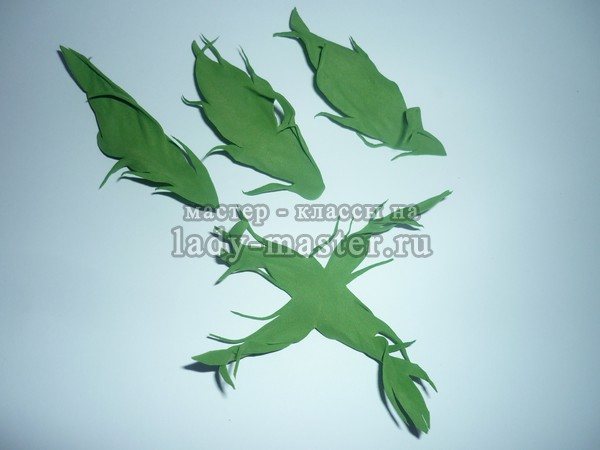 Дополнительно к розе сделаем чашелистик. Произвольно вырезаем четыре листика, которые будут соединены по центру. Длина каждого листика 6-7 см.