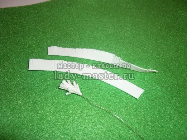 Из белого фома сделаем очень простые декоративные цветочки. Нарезаем его на полосы шириной в 1 см. Один край полосы нужно порезать на бахрому. Затем крепим один конец к проволоке и обматываем её бахромой несколько раз. После этого делаем два завитка, спускаясь ниже. Длина проволоки должна соответствовать высоте розы приблизительно.