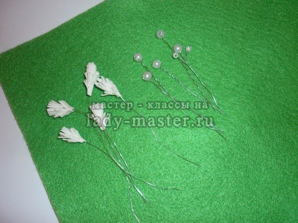Белые бусины закручиваем на проволоке. Делаем по 5 таких заготовок.