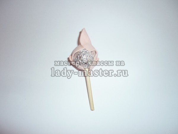 Крепим первый лепесток, формируя вверху острый угол. Облепливаем шарик фоамираном, будто жвачкой.