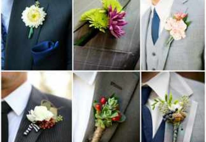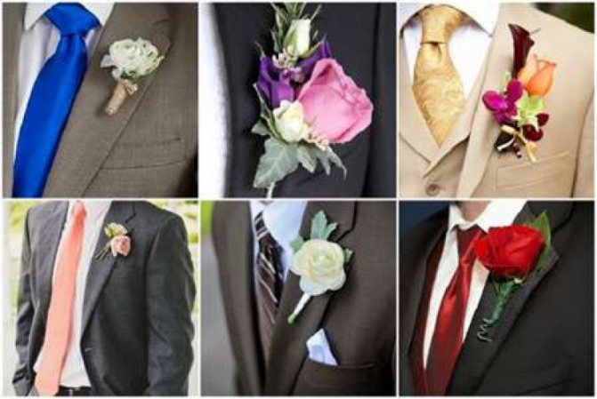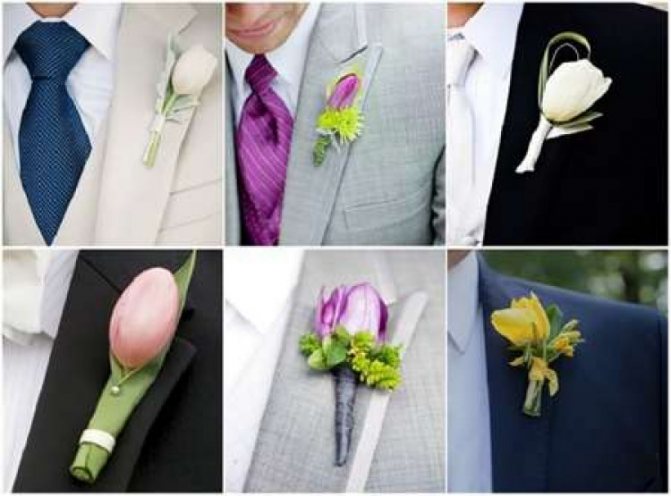 Многие невесты предпочитают выбирать одинаковые цветы для жениха и свидетеля. Однако бутоньерки должны отличаться. Для друга подбирайте более скромный аксессуар. Помните, что свежие цветы могут завянуть и испортить костюм, поэтому рекомендуется останавливать выбор на искусственных вариантах. Не стоит отдавать предпочтение ярким цветам под светлый костюм жениха, чтобы они не выглядели безвкусно. Нежелательно выбирать слишком крупные бутоньерки