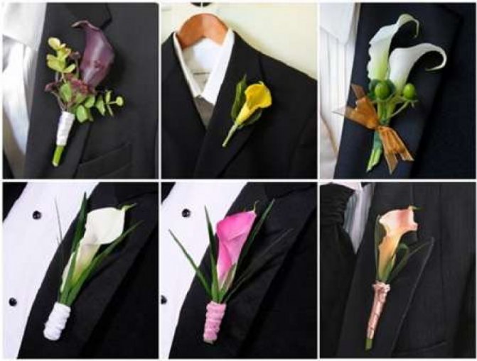 Каллы – символ красоты и здоровья. Благодаря разнообразию расцветок, бутоньерки из этих цветов подойдут под любой костюм и стиль мероприятия.