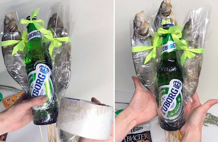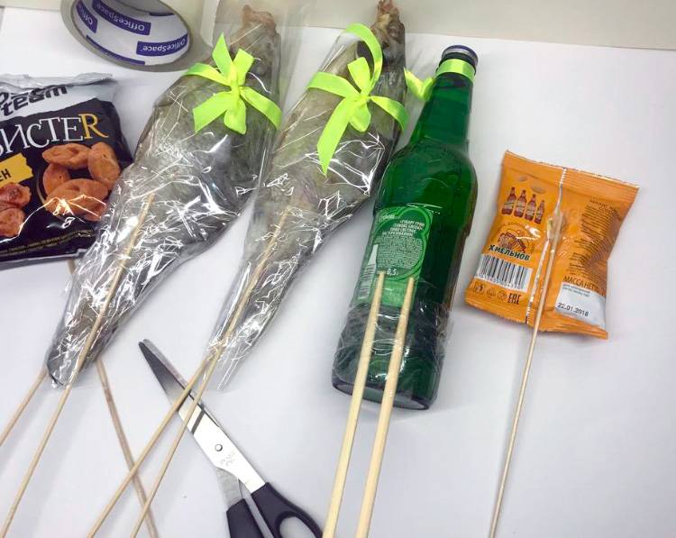 Самый простой гастрономический презент. Его можно сотворить буквально из подручных материалов! Для его изготовления ничего сложного не потребуется. Берете любимое пиво вашего одаряемого. Красивее смотрится пиво в стеклянной бутылке. Затем подбираете несколько штучек сухой рыбки (вобла, лещ, карп, таранка — а можно и положить то, что поймал ваш рыбак сам). Она непременно должна быть целой. Ещё вам потребуются шпажки. Лучше всего тонкие деревянные. И палочки для суши. Также приготовьте скотч и целлофан (плёнка). Последний желательно взять покрепче, чтобы смотрелся презентабельнее.