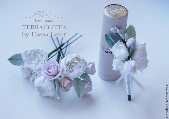 Модели из нетрадиционных материалов очень практичны: в отличии от живых украшений они не завянут. Это бутоньерки из войлока, лент, искусственных цветов. Также будет красиво и практично выглядеть композиция из полимерной глины.