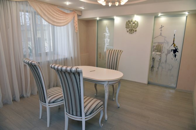 Интерьер выполнен в светлых тонах и бежевых оттенках, шторы в классическом стиле. Присутствует зеркало в полный рост, рядом с которым фотографы делают оригинальные снимки новобрачных.