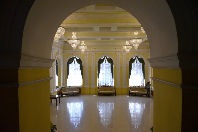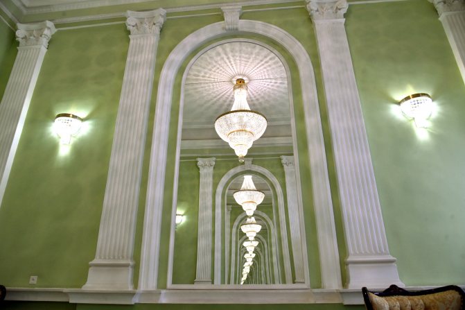 Один из элементов интерьера центрального холла Дворца – зеркала в виде арок, которые были вписаны в дореволюционные ниши. Глядя в них, можно увидеть перспективу уходящих вдаль арок.