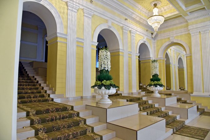 Надо сказать, что интерьеры во Дворце сделаны со вкусом, а каждый сезон здесь меняются декоративные композиции. Весной это весенние первоцветы, зимой – елочки, летом – цветы, а осенью – оранжево-желтые листья.