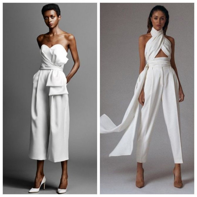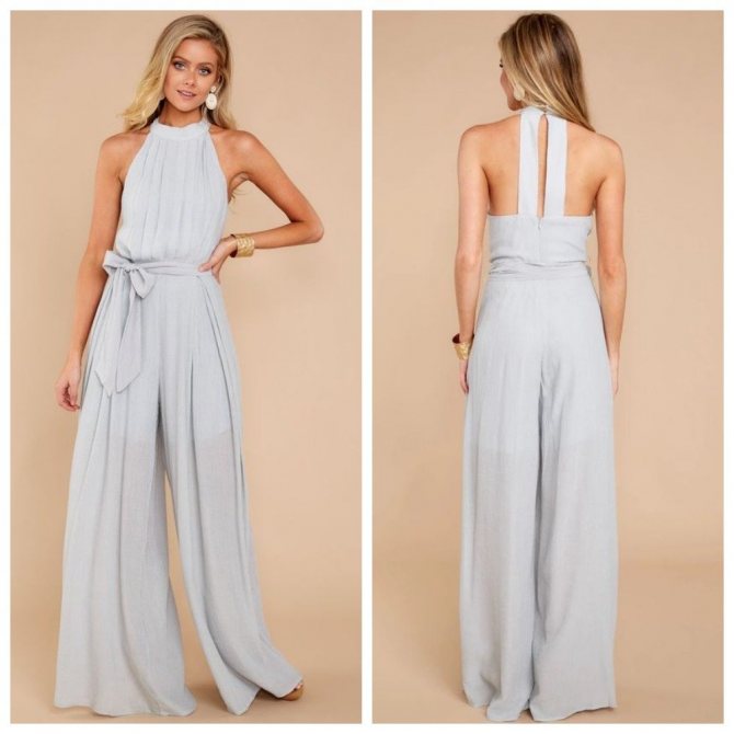 Удивить гостей на свадьбе и выделиться поможет комбинезон. Выбирать рекомендуется стильную модель с широкими брючинами. Они визуально вытягивают силуэт, создают благородный и утонченный образ.