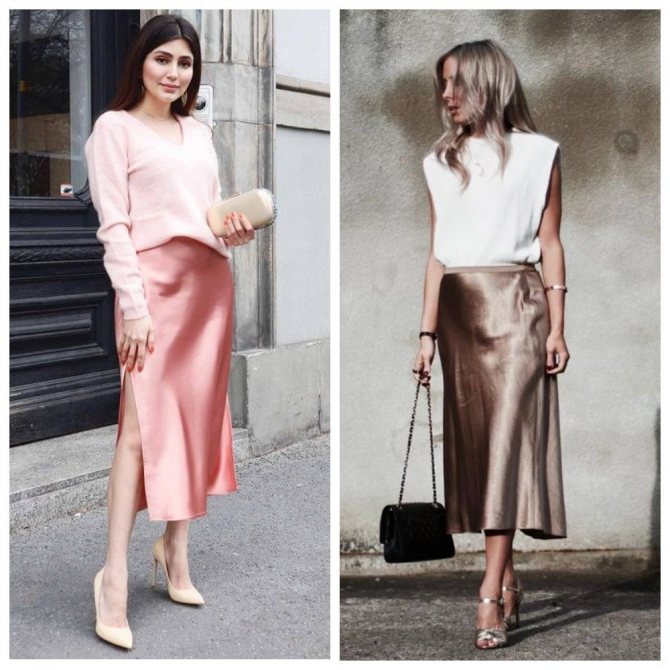 Вернемся к нарядам из шелка, которые для свадьбы подходят лучше всего. Помимо асимметричного платья, пижамы и ночнушки можно выбрать комплект из юбки и топа с необычными лямками.