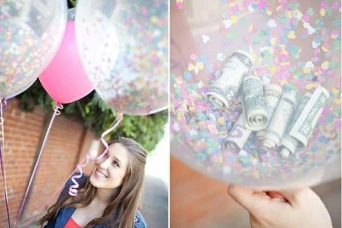 - «Конфета». Спрячьте деньги в воздушный шар, завернув его в виде конфетки. Фантиком может стать упаковка для цветов, в которую продавцы заворачивают букеты. Или можно просто поместить деньги и цветное конфети в шарик и накачать его гелием.
