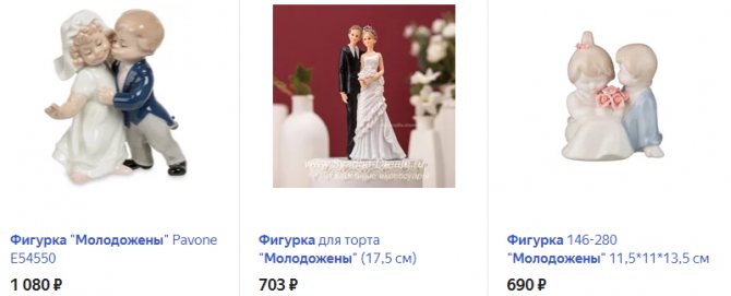 - Фигурки молодоженов. Вполне традиционный свадебный сувенир. Фигурки не только будут украшением интерьера, но и станут для новобрачных домашним оберегом.