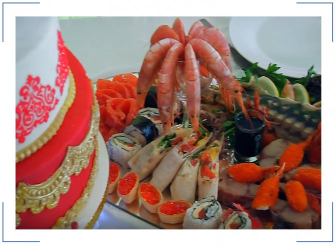 Банкет не оставляет места голоду — все дни празднования столы ломятся. В изобилие сложные люда, предполагающие сразу несколько кулинарных процессов. Если торжество домашнее, все меню без исключения готовит женская половина семьи, включая невесту. В ресторанах также не обходятся без своих блюд.