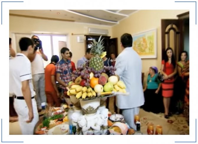 В случае, когда за невестой приходят к ее родным, девушка показывается гостям, но сватовство проводится исключительно мужчинами. Обязательный атрибут – ветвь дерева, украшенная бумажными деньгами или монетами, вручаемая отцу будущей новобрачной. Он же назначает немалый выкуп (часто родители жениха с его рождения начинает копить деньги и драгоценности).