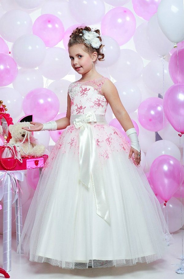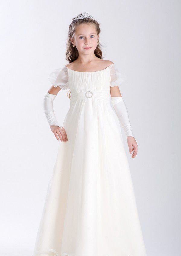 Бальное свадебное платье для девочки можно дополнить перчатками, сумочкой, шляпкой, зонтиком, а в холодное время года – шубкой или болеро.
