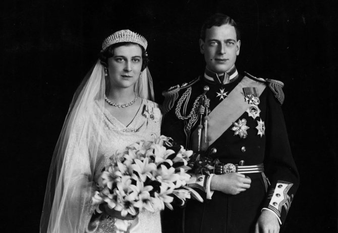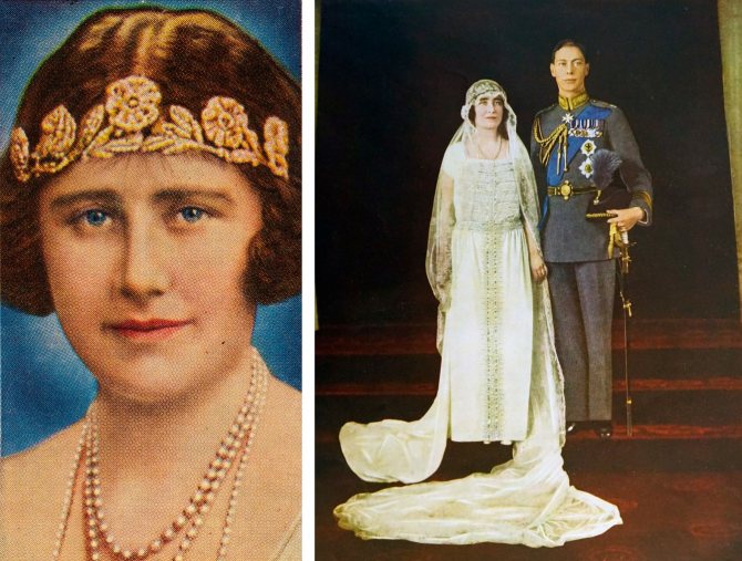 Елизавета Боуз-Лайон была супругой короля Георга VI и матерью нынешней королевы Великобритании Елизаветы II. Ее свадьба с будущим монархом состоялась 2 апреля 1923 года. Строго говоря, она не надевала тиару на свое торжество: мало того, что невеста предстала перед женихом в нетипичном для аристократок прямом подвенечном платье, модном в 1920-х, ее голову украшала кружевная вуаль Марии Текской (бабушки Елизаветы II) и венок из мирта.