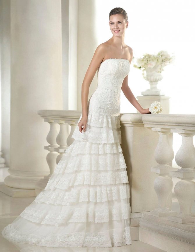Платья свадебные благодаря такому оформлению получаются роскошные и несколько озорные за счет объема и подвижности юбки, но не лишаются изначально задуманной грациозности. В данном случае также уместно применение кружева. Например, в виде своеобразной окантовки.