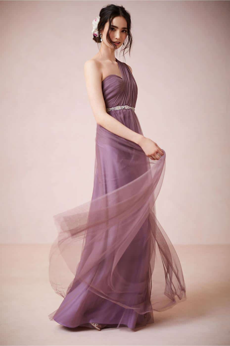- с бретелькой только на одном плече. Данный вариант весьма интригующий и волнительный. Бретелька может дополнительно украшаться с помощью цветка. Чтобы подчеркнуть линию талии, достаточно при этом воспользоваться пояском, выполненным из той же материи;