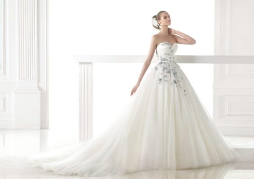 Среди многочисленных фото красивых свадебных платьев особое внимание привлекает наряд с многослойной, необъятной фатиновой юбкой. Благодаря применению цветочной аппликации он выглядит невероятно романтично. Особый шар ему придает окантовка контрастного цвета.