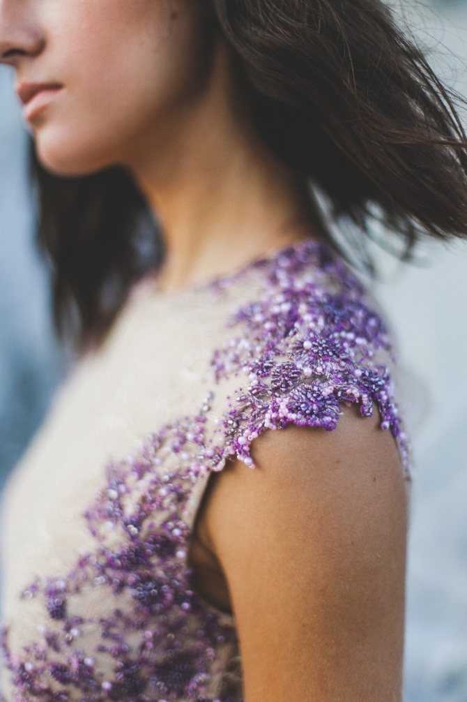 - • Блестящий декор: камни, стразы, бисер, бусины, стеклярус. Создает более гламурный и торжественный образ. Также будет уместен на винтажной свадьбе.
