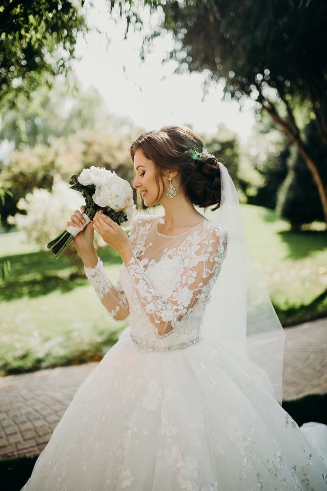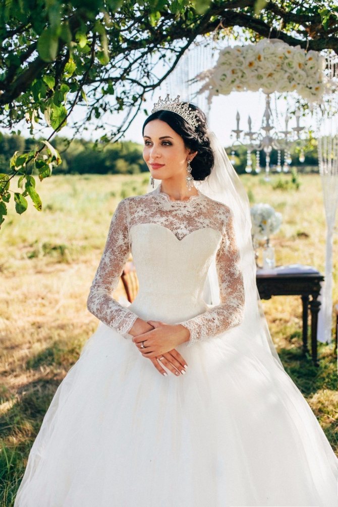 Традиционная свадьба подразумевает классический образ невесты – это платье с пышной юбкой, каблуки, фата. Это тот случай, когда уместен «бальный» фасон и длинный шлейф, роскошная отделка, кружево. Цвет также предполагается классический белый, допустимы оттенки шампань и айвори.