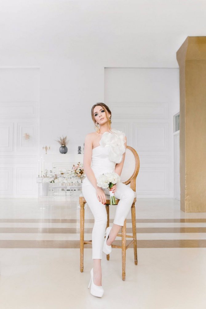 Вряд ли придется кстати на классическом торжестве, но если ты планируешь камерный праздник «только для своих» — почему бы и нет? Еще один вариант — платья-трансформеры, состоящие из комбинезона и отстегивающейся верхней юбки. Несомненные плюсы костюма: комфорт, экономия, практичность.