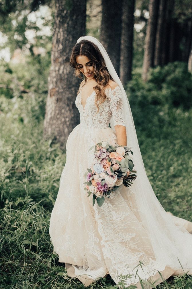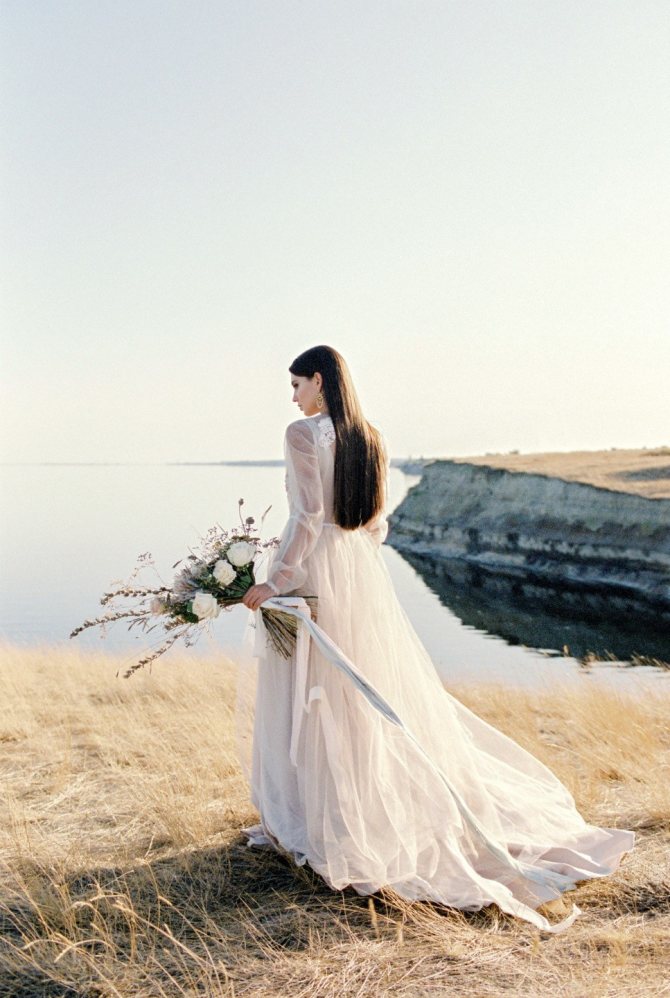 - • Длинные рукава. Создают изысканный, благородный образ. Длинные рукава из летящих тканей — прекрасный вариант для романтичного стиля, а кружевные рукава добавят роскоши традиционному образу.