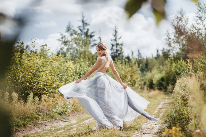 Тенденция, которая сохраняется для второй свадьбы, — отказ от объемных юбок с кольцами. Еще одно правило — отказ от фаты, но если запланировано венчание, нужно будет предусмотреть эту деталь свадебного костюма или подготовить подходящий платок.