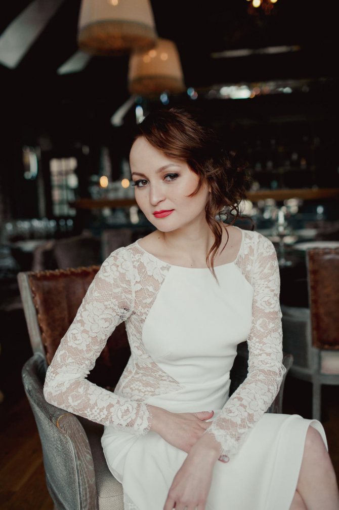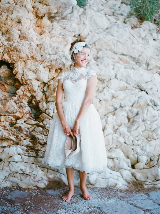 Короткое платье может быть совершенно разным: облегающим или пышным, с удлиненной или мини-юбкой, из фатина или плотного кружева. Подойдет для винтажной свадьбы или праздника в стиле casual.