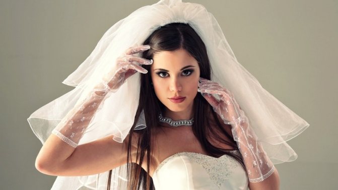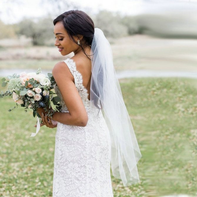 Если головное покрытие до локтя, оно считается универсальным, то фата, что доходит до кончиков пальцев, подойдет даже к короткому платью.