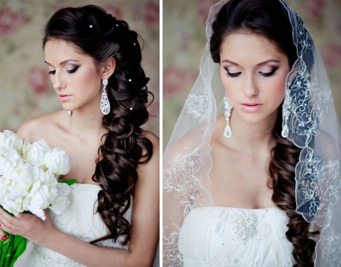 - Распущенные локоны. Для крепления головного убора и удобства несколько прядей нужно убрать от лица, закрепив их на затылки. Пряди можно оформить скатать в валики или оформить в косы. Лучший вариант – скомбинировать и то и другое, как показано на фото причесок с фатой.