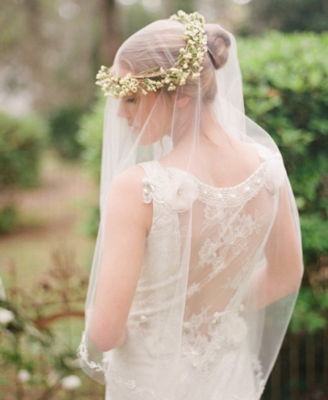 Легкая вуалька гармонирует с цветами или венком, собранные волосы в прическе не будут вылезать в разные стороны.