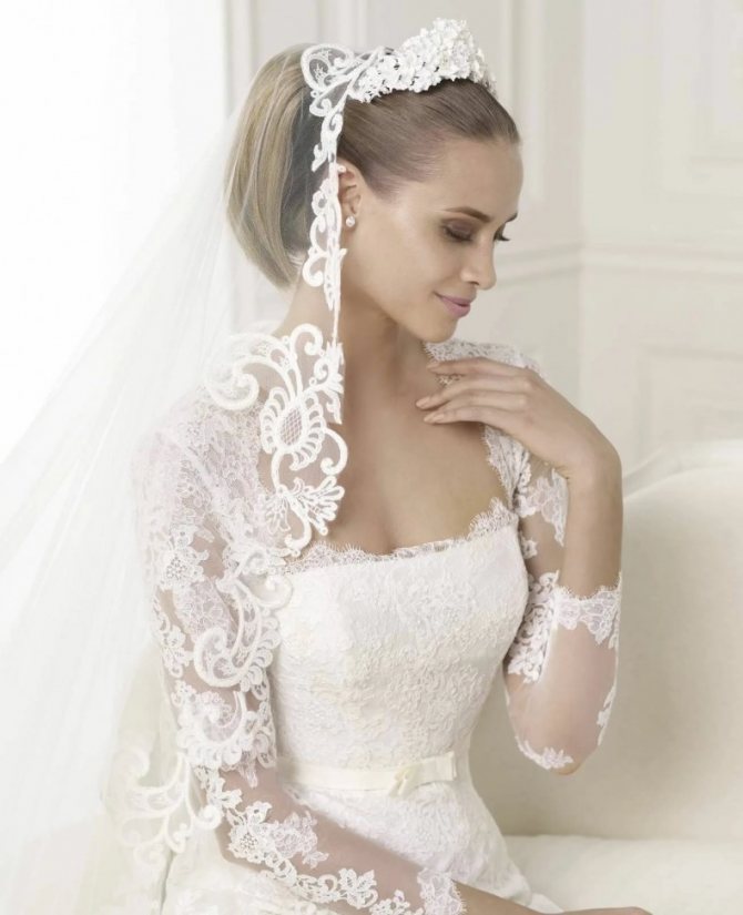 - мантилья – модель, требующего особого крепления. Поверх головы она укладывается как изысканный кружевной платок, ниспадающий на плечи. Эта фата должна быть легкой, невесомой, лишь по краю декорированной кружевной вышивкой. Прическа под такую фату – это гладкая, стильная укладка;