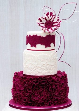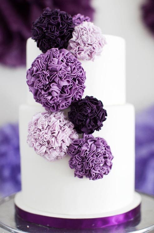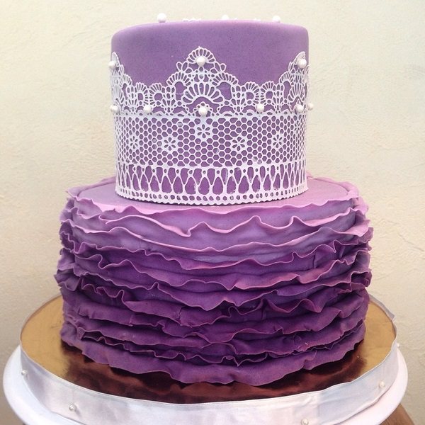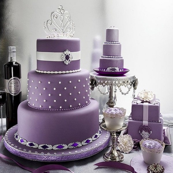 Свадебный торт часто сочетается с общим стилем и цветом торжества. Он может быть выполнен как чисто в фиолетовом или сиреневом цвете, либо в тандеме двух этих цветов или же быть дополнен другим, например, белым. Отлично смотрятся торты, выполненные в нескольких оттенках одного цвета.