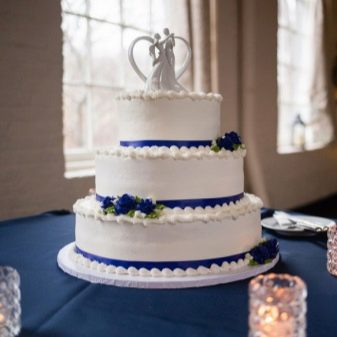 Можно принять авангардное решение, и заказать торт, имеющий форму подарочной коробки, перевязанной синими ленточками из мастики и белоснежным огромным сахарным бантом. Белый торт можно украсить ажурной росписью тонкого синего или голубого кружева, таким способом вы получите воплощение нежности, элегантности и утонченности. Основа торта может быть не только белая, но и других очень нежных изысканных пастельных тонов. Декорировать можно разноцветными бусинками, шикарным жемчугом, сделанными из мастики. Серебряными или золотыми бусинками выкладывают имена или инициалы жениха и невесты.