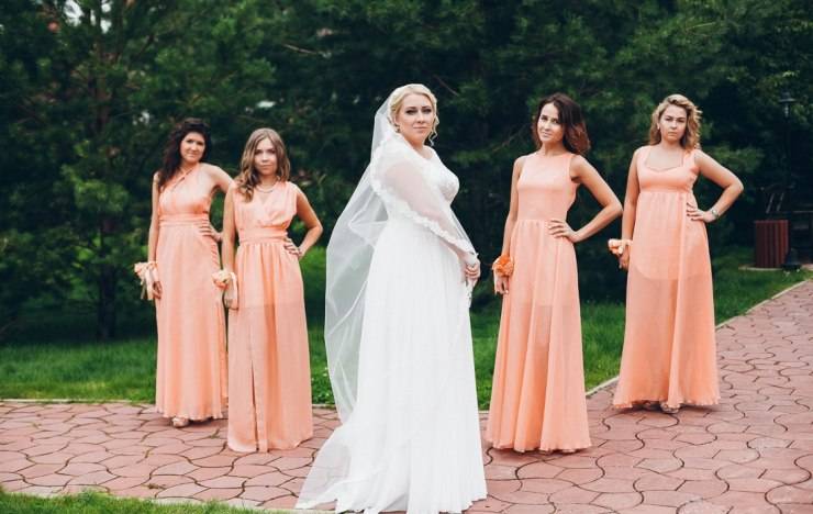Платье невесты и костюм жениха обязаны отражать тематику свадьбы. Наряд новобрачной может быть светлого оттенка персика или абрикоса — никаких вызывающе ярких расцветок. В моде сейчас пастельные, естественные оттенки.