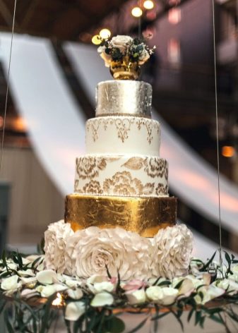 Воплощением королевской торжественности является бело-золотой свадебный торт. Он неподражаем как на золотой, так и на белоснежной основе. Очень актуально присутствие серебряных и золотых украшений на тортах, эти цвета все века считались символом роскошной жизни и богатства. Краски серебра и золота добавляют в детали украшений, таких как бусинки, кружева, розочки.