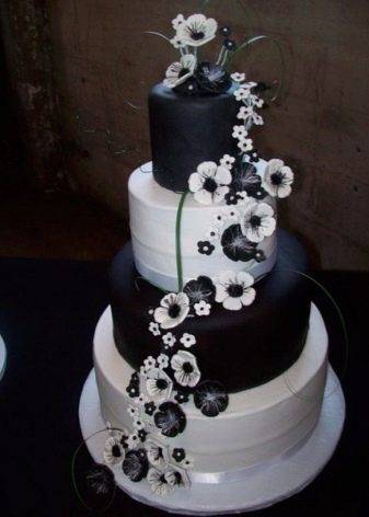 Черный цвет добавлять в композицию надо очень осторожно, при малейшей ошибке получится агрессивный и неэстетичный вид. Оформление кондитерского изделия белоснежного цвета черной вычурной тонкой сеточкой или элегантным кружевом позволит сделать его изысканным и изящным