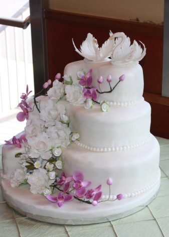Этот момент очень важно обдумывать заранее, обговаривая все нюансы с кондитером и организатором свадьбы. Если не хочется полностью украшать торт живыми цветами, то можно без труда разнообразить его при помощи классических фигурок лебедей или каких-то других фигур из мастики. Выбирая свадебный торт с живыми розами, следует быть осторожными, поскольку именно эти цветы очень быстро начинают вянуть без доступа к воде. А вот орхидеи, наоборот, стоят достаточно долго, да и выглядят очень оригинально.