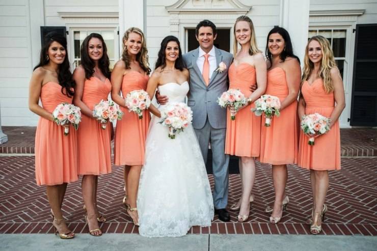 Если невеста предпочитает традиционное белое платье, то персикового цвета могут быть аксессуары: цветы, поясок, клатч, туфельки. В качестве украшения желательно выбирать жемчужные бусы, цветочные композиции.
