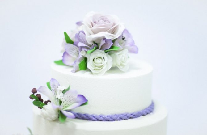 Нередко для украшения свадебного десерта используют цветы. Кондитеры с помощью каскада из бутонов создадут настоящее произведение искусства. Часто используются цветы из крема, но наиболее впечатляюще выглядят сиреневые бутончики живых растений: лаванды, ириса, орхидей, пионов и т.д. Каждый элемент можно сделать съедобным. Создать нежный и воздушный сиреневый свадебный торт без мастики помогает кондитерское кружево и орнаменты.