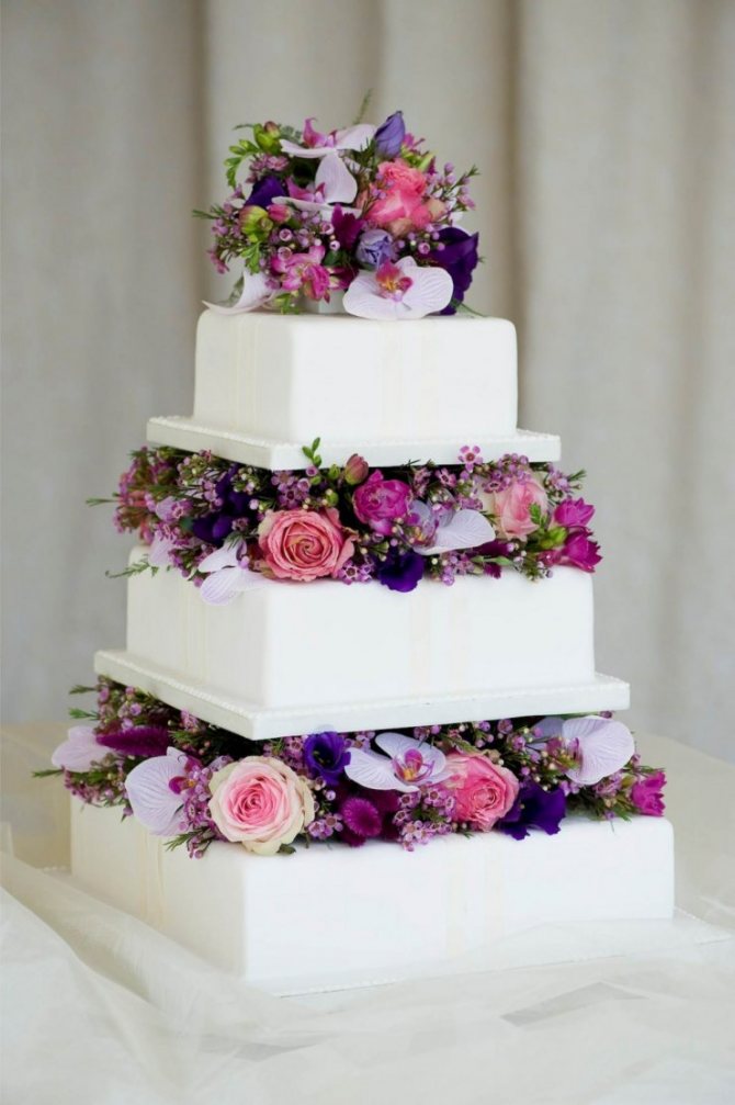 Это могут быть полевые цветы или же благородные орхидеи, розы, пионы. В любом случае, контраст цветов фиолетового тона на белоснежном торте или на десерте с зеркальной поверхностью – это беспроигрышный вариант для свадебной церемонии.
