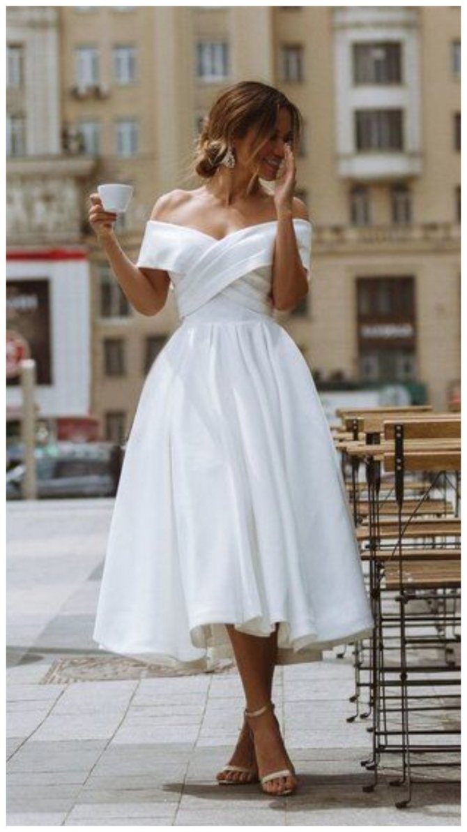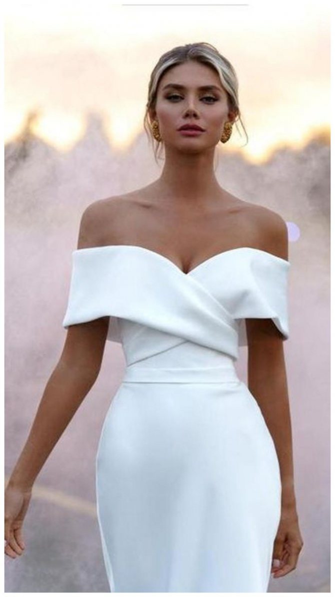 Несмотря на то, что для праздничного выхода в свет многие модницы выбирают корсеты, на свадьбу рекомендуется отказаться от них. Вместо этого отдаем предпочтение легкому платью, напоминающему сарафан или лаконичному изделию, которые выполнено из плотной ткани, сохраняющей форму.