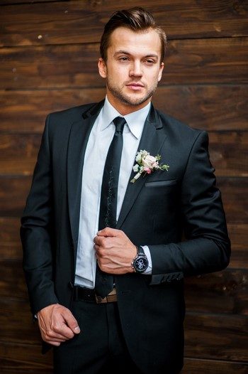 Однотонный костюм можно освежить аксессуаром с принтом, либо моделью из однотонной ткани контрастного цвета. Один из модных трендов формирования современного образа жениха – черный костюм, белая рубашка и черный аксессуар.