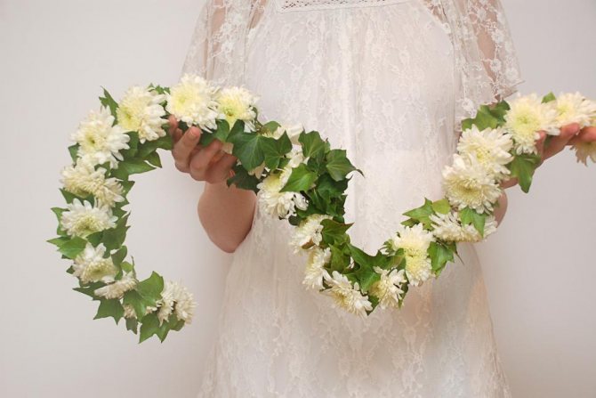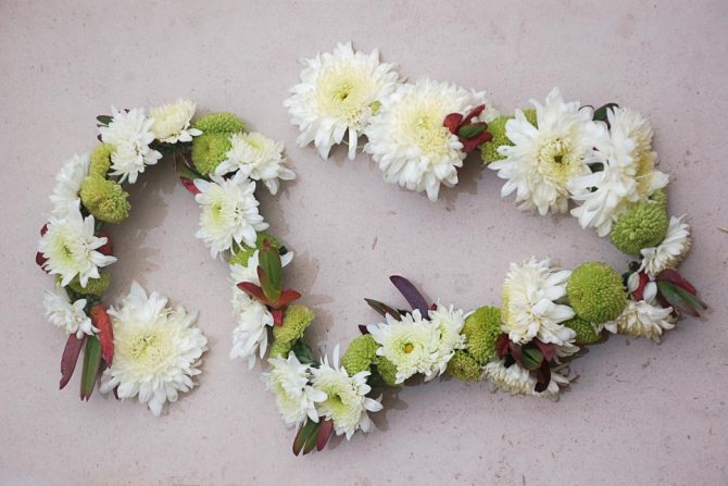 Свадебные гирлянды являются идеальным и очень универсальным дополнением к другим деталям свадебной декора. Используйте их для создания свадебной арки, драпировки над стульями, повесьте их на столах или над дверями и даже на вашем автомобиле! Предлагаем несколько вариантов использования живых цветов для создания трех различных гирлянд, каждая из которых порадует своим уникальным видом. Основой каждого украшения в данном случае стала белая хризантема, однако эти гирлянды могут быть созданы из любого вида живых цветов.