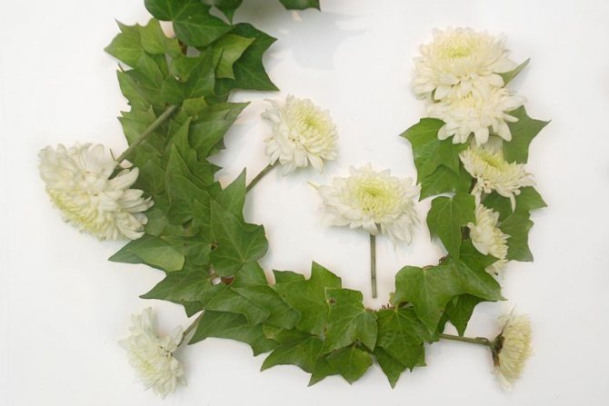 В этой гирлянде можно успешно использовать белые хризантемы, причем их количество также варьируется от минимального до максимального. По желанию.